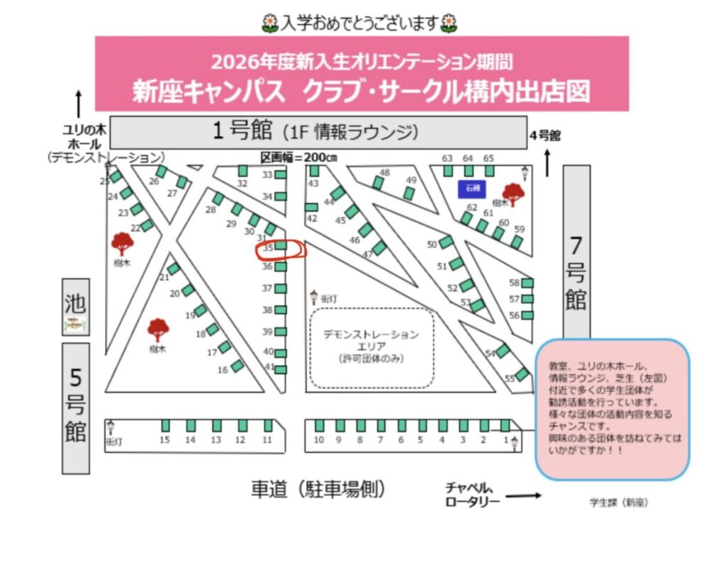※4月1日・2日に配布いたしましたチラシに記載されたQRコードに誤りがありました。ご迷惑およびご混乱をおかけしましたこと、深くお詫び申し上げます。3日以降の新歓にて配布するチラシは訂正済みですので、ご安心ください。